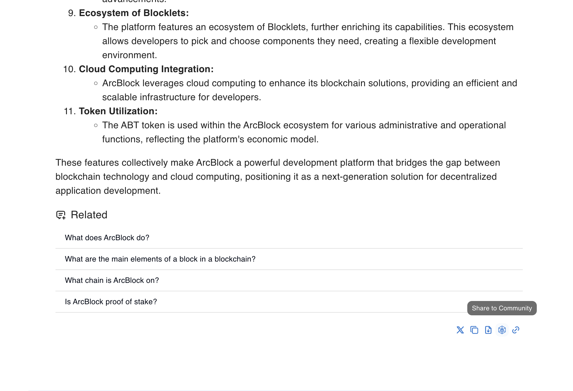 - Agent 应用中的输出中将显示 ArcBlock Community 按钮,点击后即可分享到 ArcBlock Community
