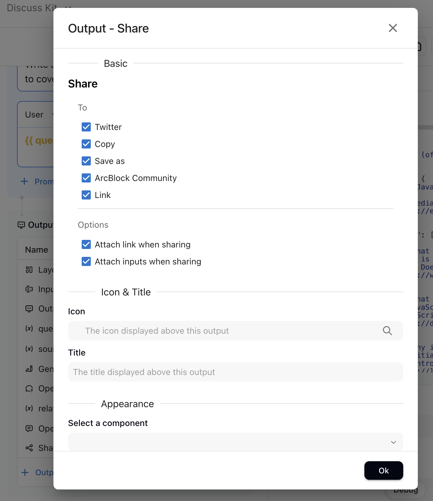- 在 AIGNE Studio 中为 agent 设置 share 输出选择 ArcBlock Community 选项