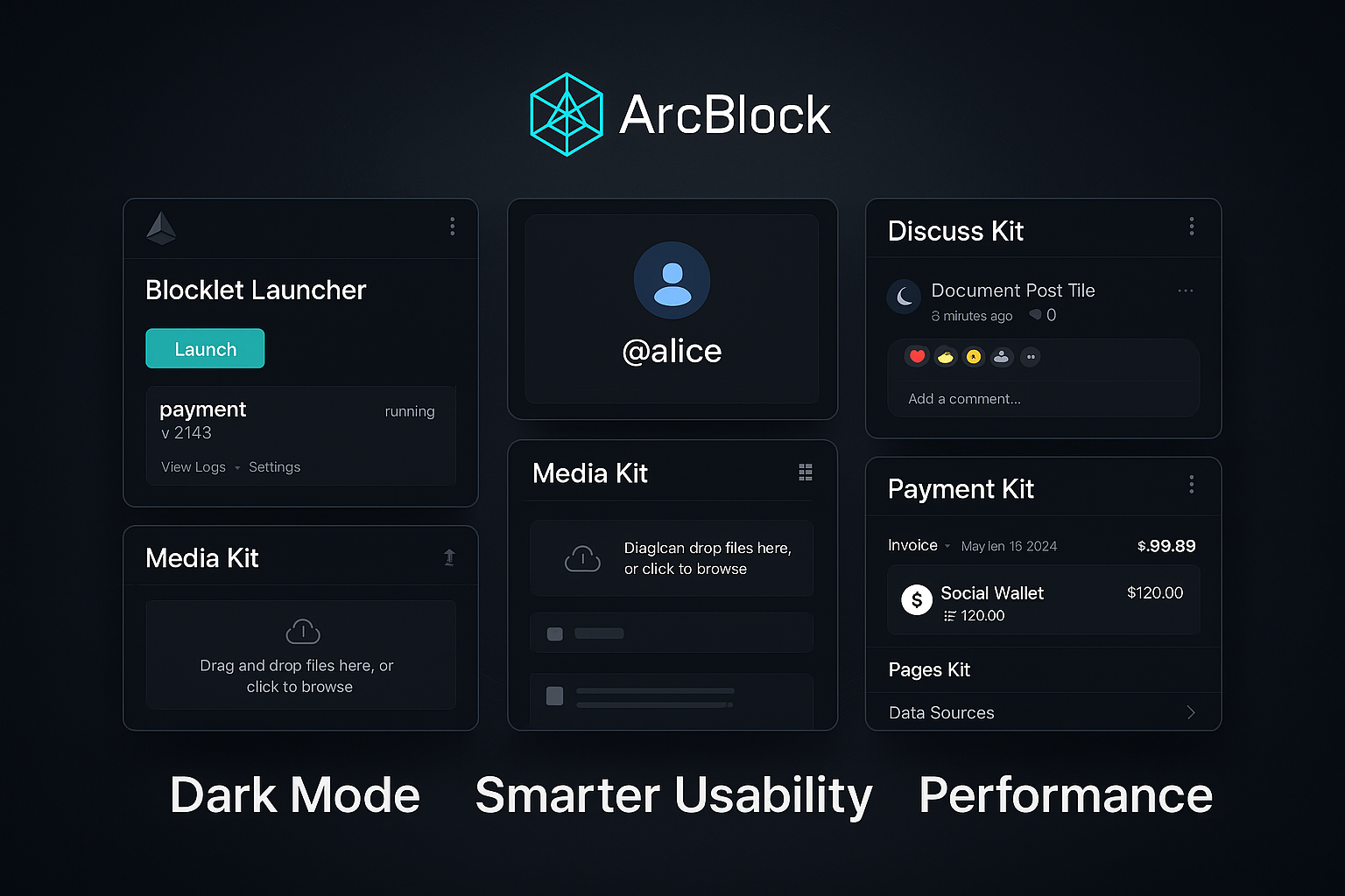 ArcBlock is raising the bar for decentralized development. The latest wave of updates across Blocklet Launcher, DID Spaces, Discuss Kit, Media Kit, Payment Kit, and Pages Kit delivers a unified dark mode, smarter usability, and performance enhancements that directly address real user and developer pain points.
