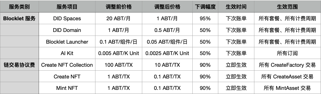 CreateAsset交易。 - Mint NFT:同样从每交易 1 ABT 调整为 0.1 ABT,降价 90%,已经生效,覆盖所有