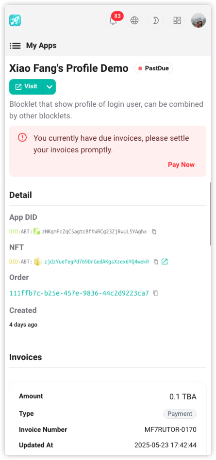 - 欠费的应用将展示欠费提示,并支持直接在页面内“立即支付”以恢复使用。
