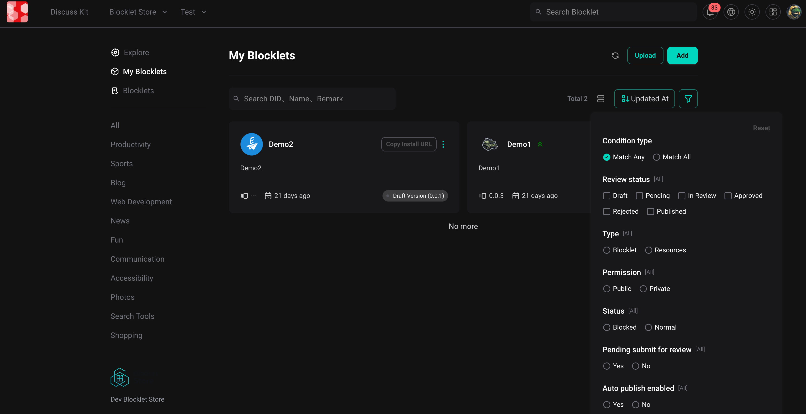 • 深色主题支持:此版本最显著的改进是 Blocklet Store 全面支持深色模式。该功能旨在提供更舒适的视觉体验,尤其是在光线不足的环境中。深色主题并非简单的颜色反转,而是对各种 UI 组件进行了精心设计,以确保整个平台的视觉一致性和美观性。
