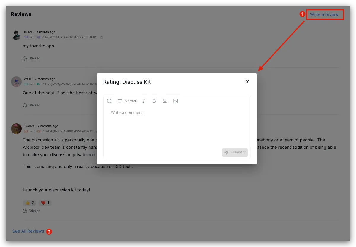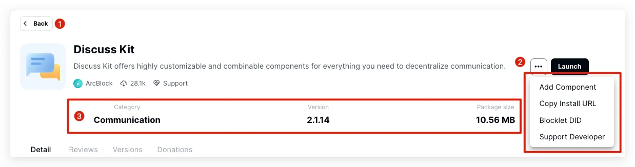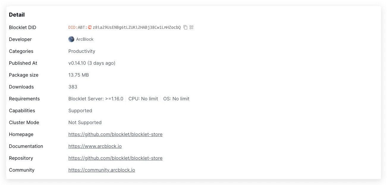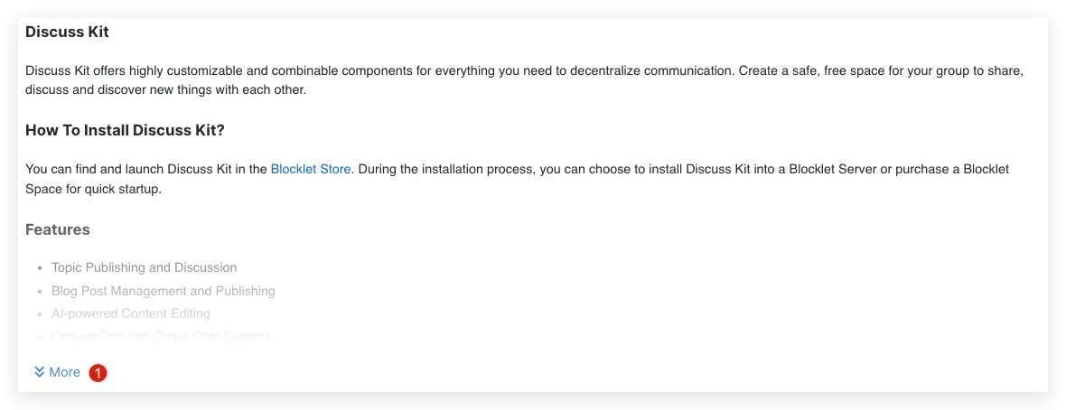 简略展示 Blocklet 的介绍信息,可以通过 ① 展开 按钮,查看所有的介绍内容。