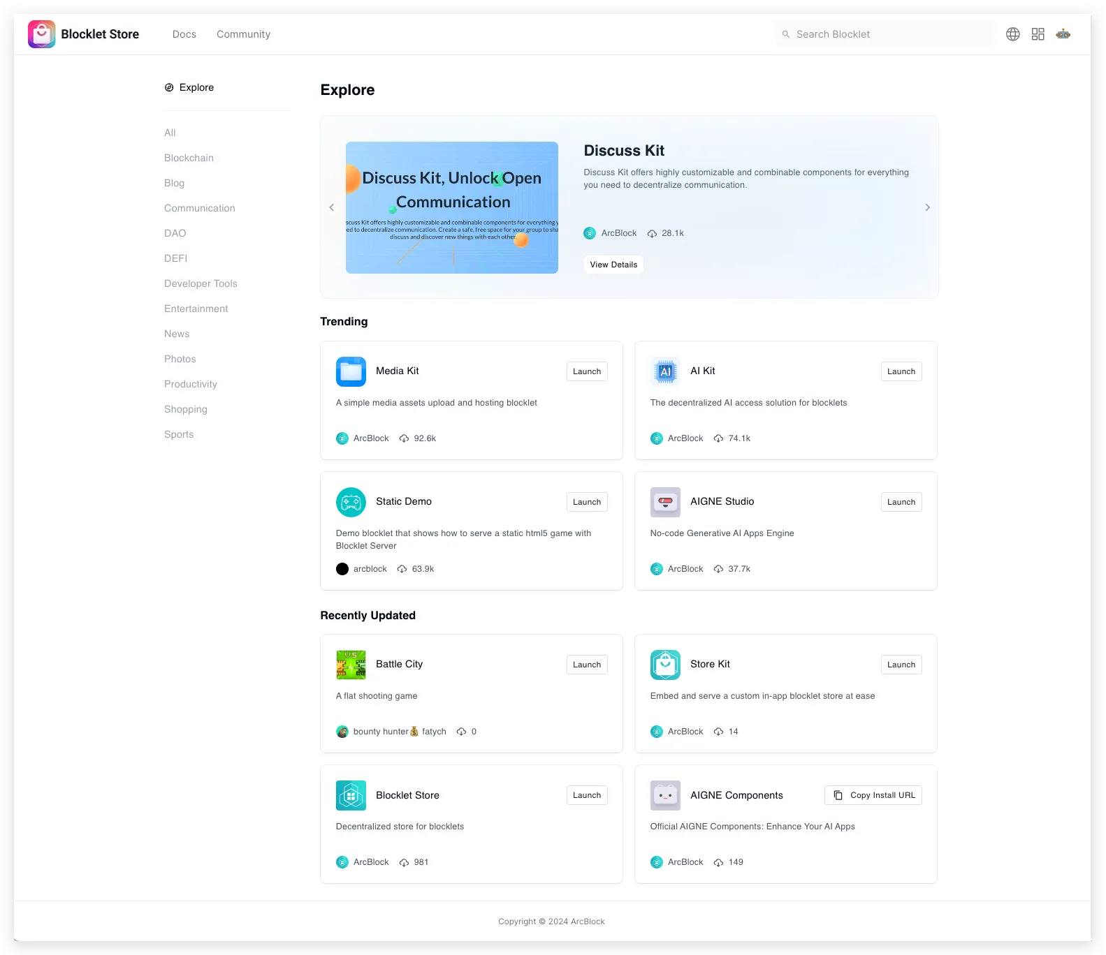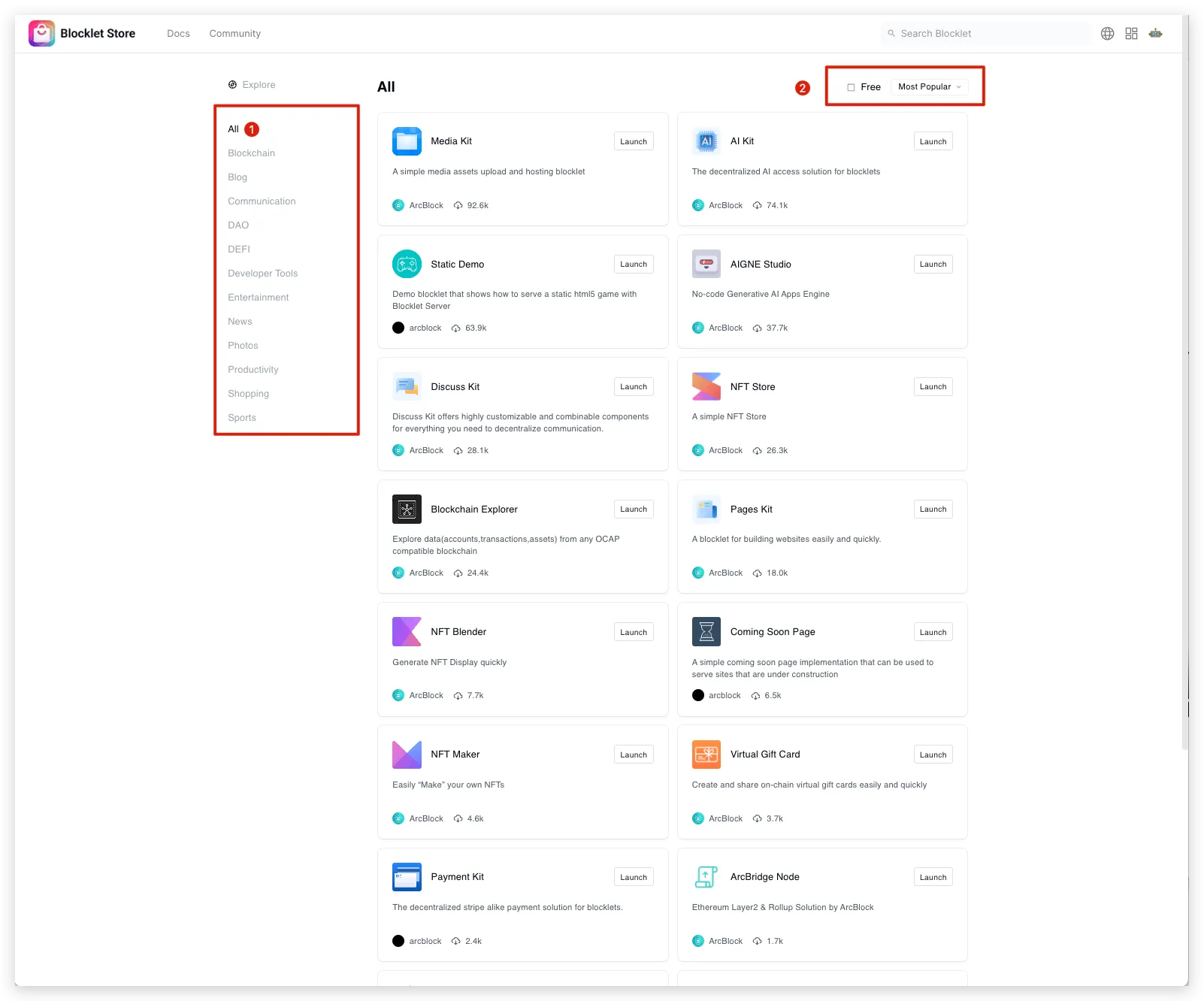 - 显而易见的 ”全部“ 分类,帮助您快速浏览所有的 Blocklet。