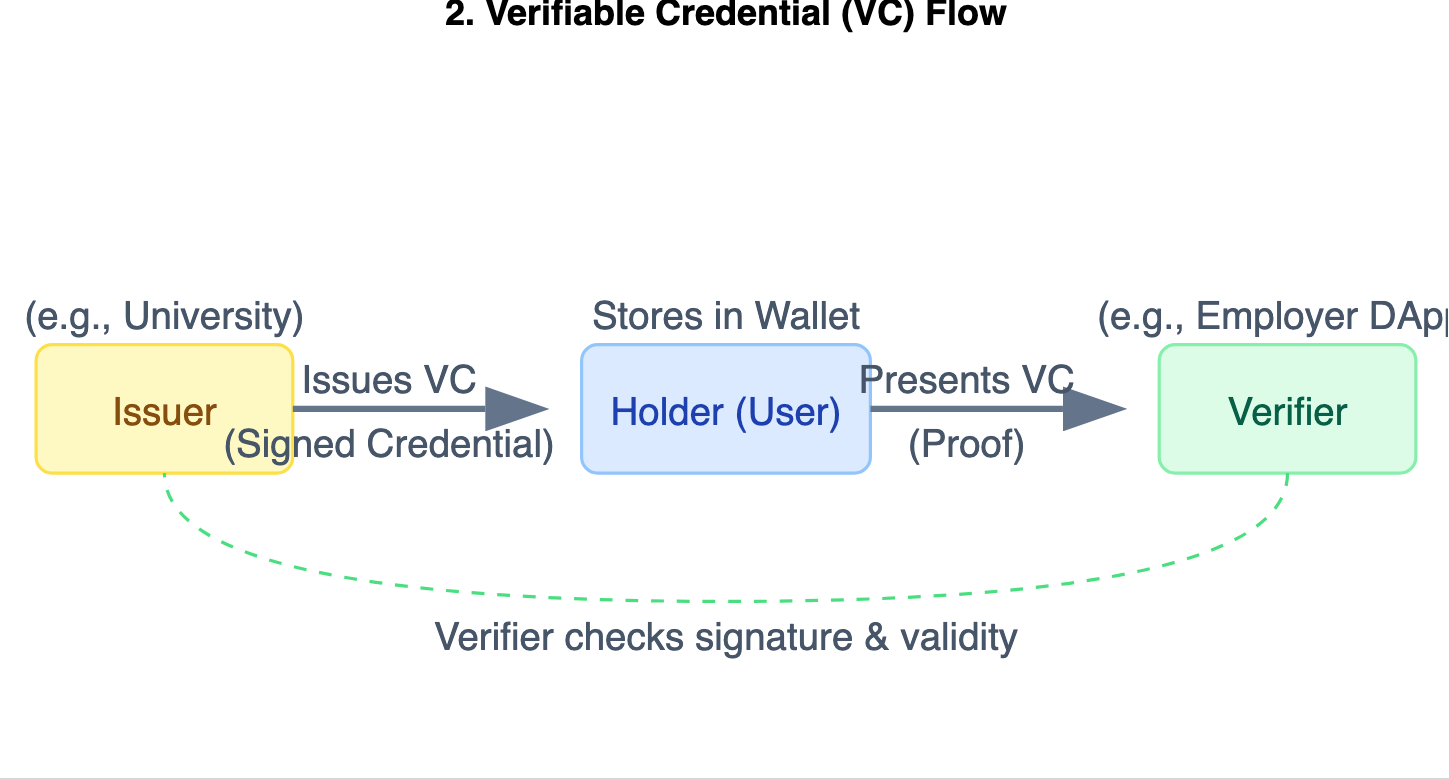 For Non-Technical Builders (The "So What?"): This enables smoother, more secure logins ("Sign in with your Wallet"). It builds user trust because you aren't unnecessarily collecting and storing sensitive data. You can verify user attributes (like community membership and qualifications) required for your DApp without cumbersome processes or privacy risks. We saw a recent example of this at a large identity organization where non-approved members accessed meetings and tools that should have been restricted. With DIDs and VCs, each user can receive permission to access specific tools and restrict them to others.