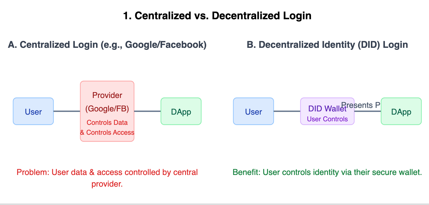 - What It Is (Conceptually): At its core, DID is like giving users a universal, self-owned digital passport. Instead of relying on accounts created and controlled by companies (like Google, Facebook, or Apple), users manage their identity information using secure, blockchain-based technology. They can then prove things about themselves directly to DApps without needing a central middleman.