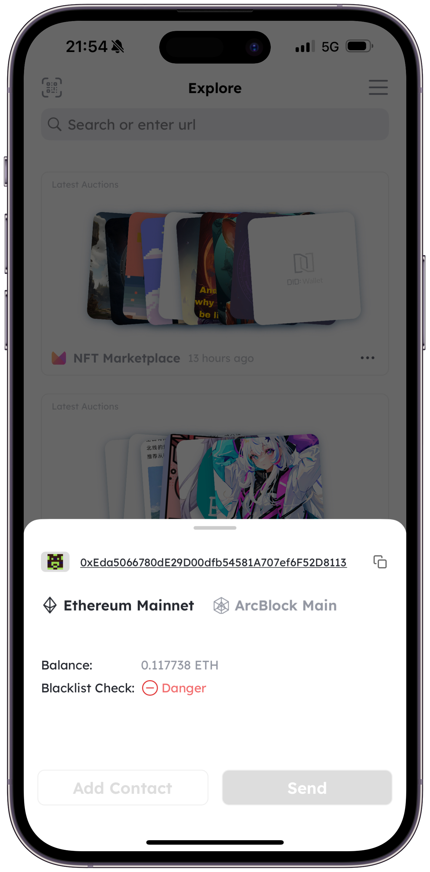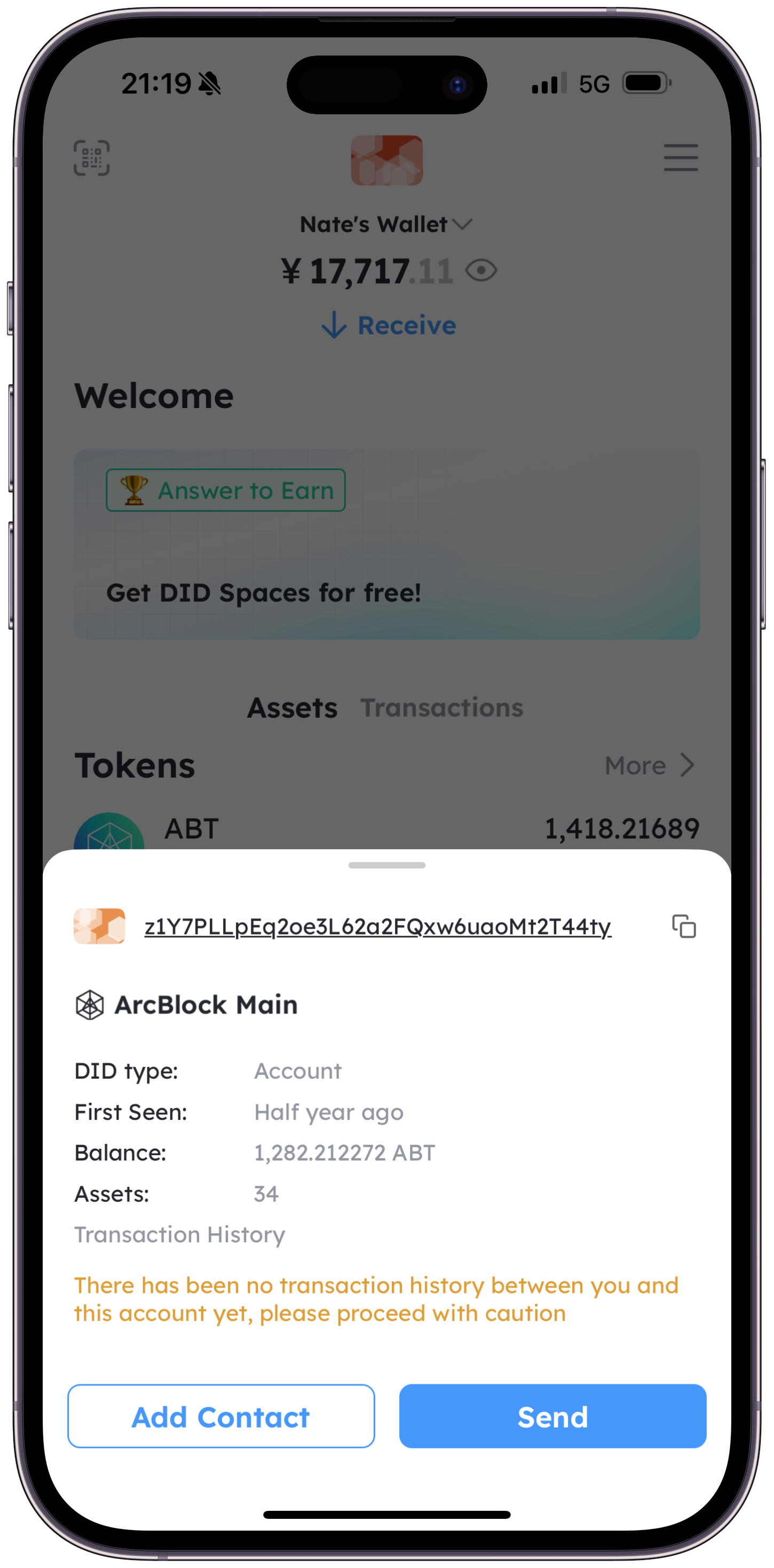 除了 ArcBlock 自己的 DID 地址,我们还能识别以太坊主网的账户信息。下面是扫描一个以太坊地址得到的结果,钱包可以智能的识别 ENS 和查询链上的一些实时资产信息,帮助用户更好的确定地址信息: