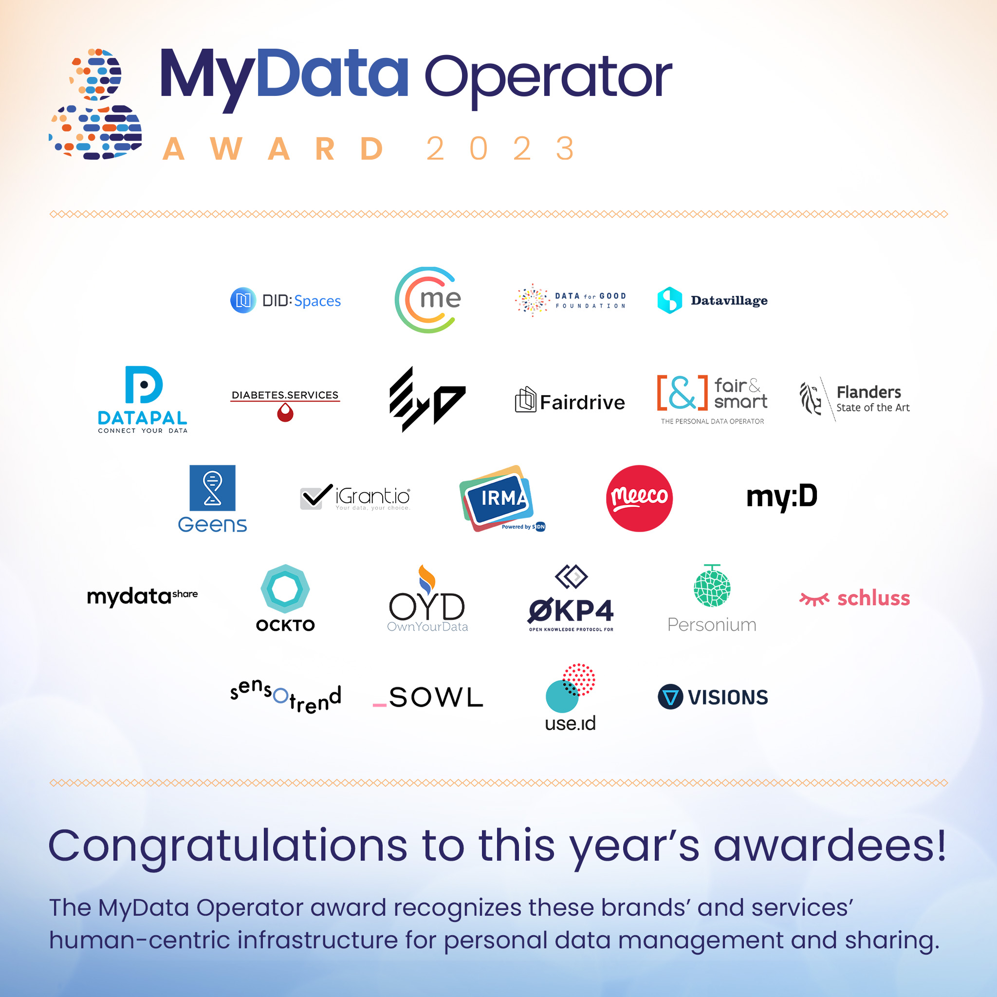 The MyData Award is the gold standard for ethical use and sharing of personal data. The MyData Award 2023 recognizes and celebrates human-centric solutions around the world. Applying companies can either receive the MyData in Practice status if they provide personal data based services to individuals in line with MyData principles, or the MyData Operator status it they provide a human-centric infrastructure for using and sharing personal data.