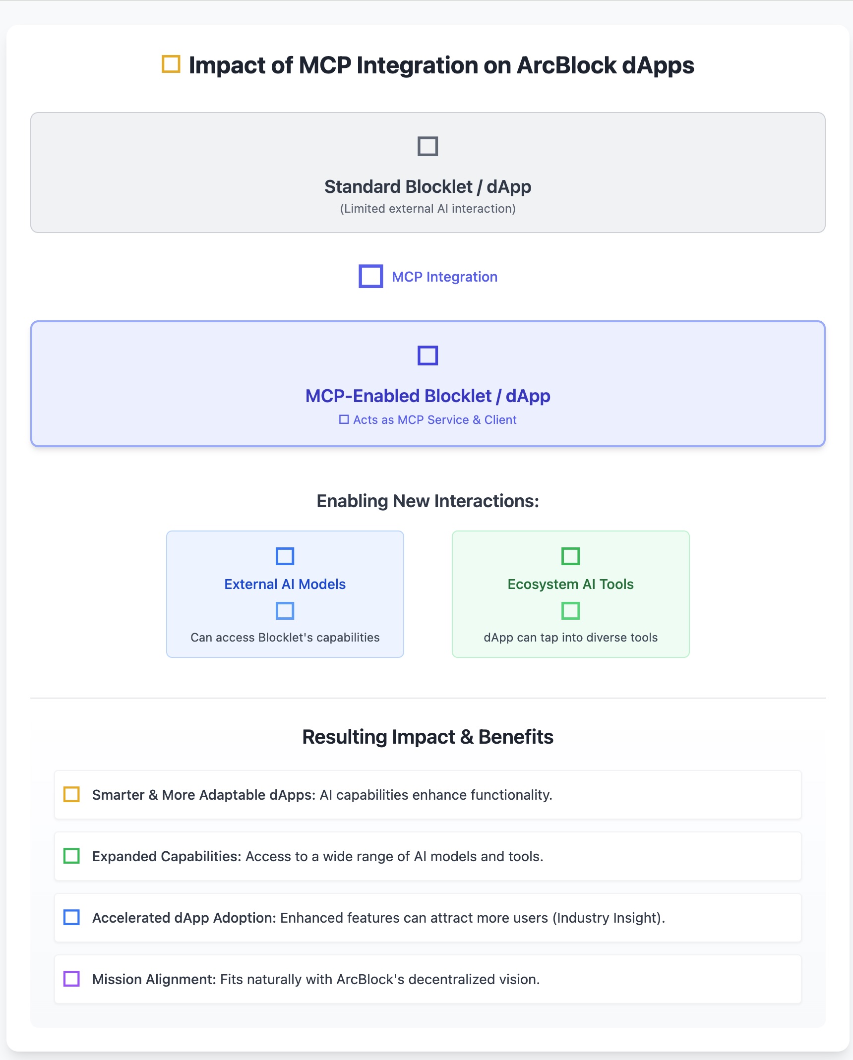 MCP integration could revolutionize dApps on ArcBlock by making blocklets MCP services, accessible to a wide range of AI models, and allowing dApps to tap into diverse AI tools ecosystem-wide. This expands dApp capabilities, driving smarter, more adaptable applications—a natural fit for ArcBlock’s decentralized mission ArcBlock, "dApp Development"]. Industry insights suggest this could accelerate dApp adoption Medium, "MCP: Revolutionizing AI Integration," 2025].