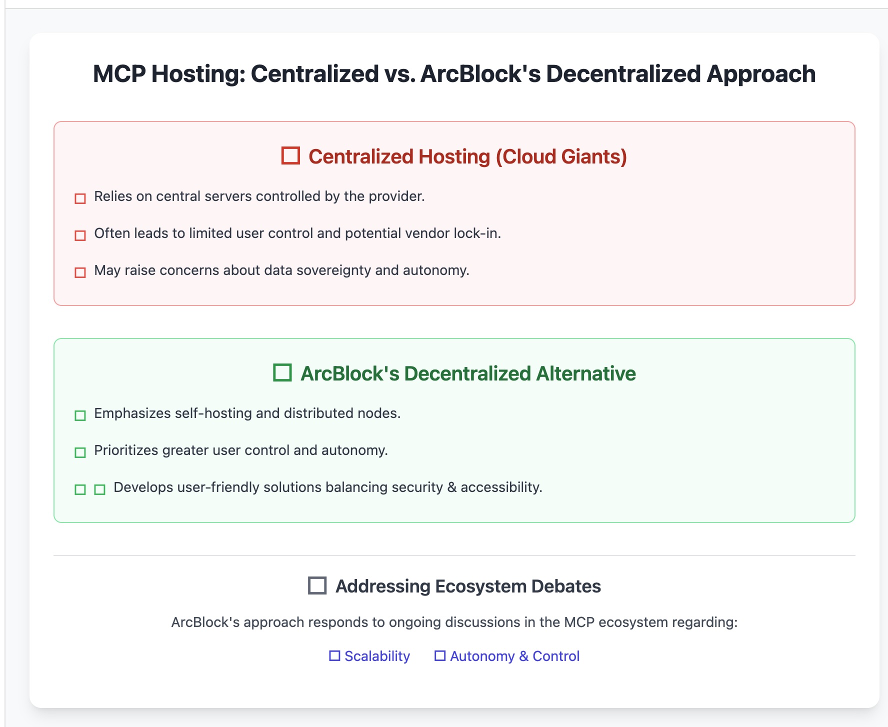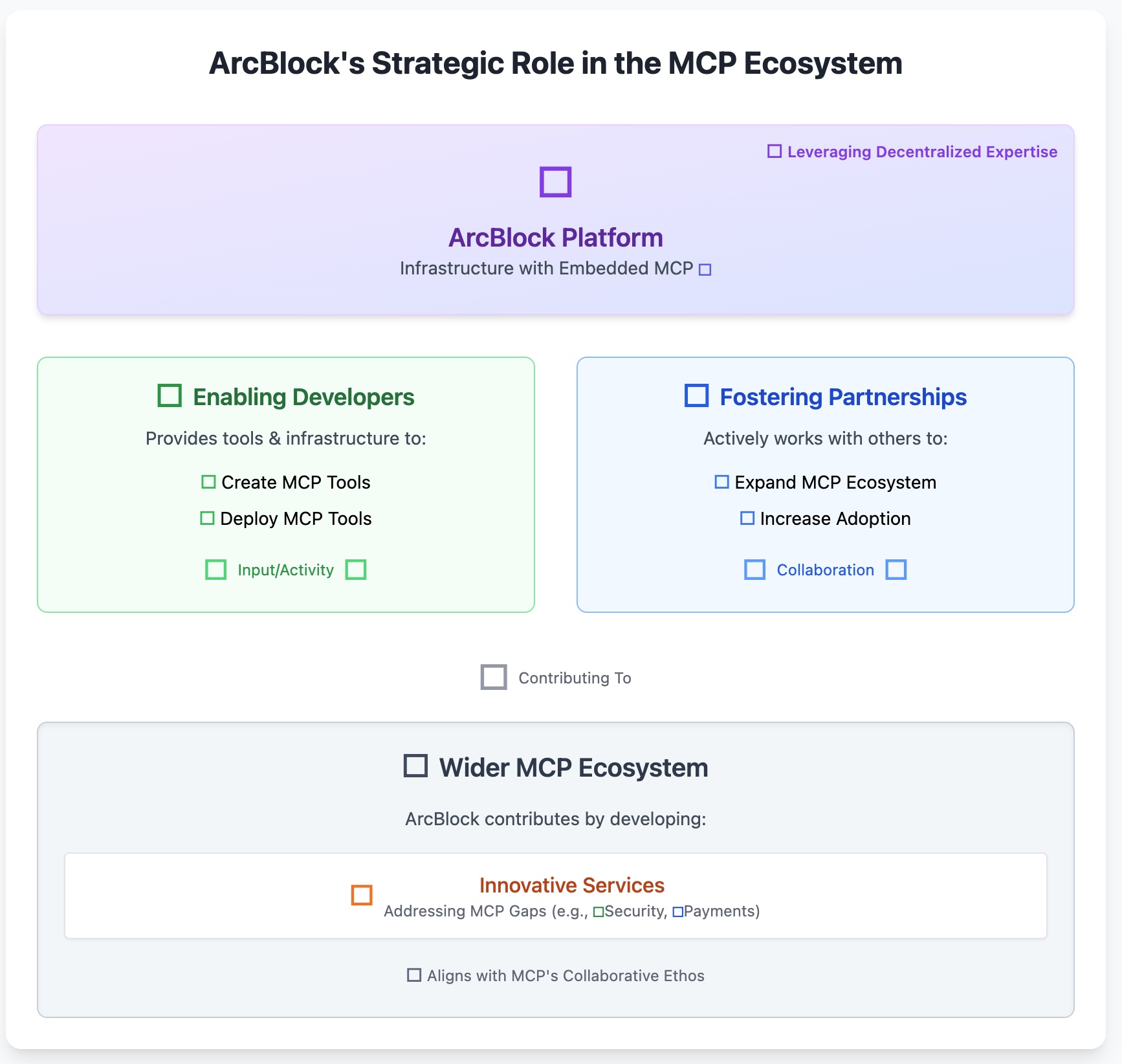 ArcBlock positions itself as a key player by embedding MCP into its infrastructure, enabling developers to create and deploy MCP-compatible tools. It plans to foster partnerships to expand the ecosystem and develop innovative services addressing MCP’s gaps (e.g., security, payments), leveraging its decentralized tech expertise ArcBlock, "Partner Ecosystem"]. This aligns with MCP’s collaborative ethos Anthropic, "MCP GitHub"].