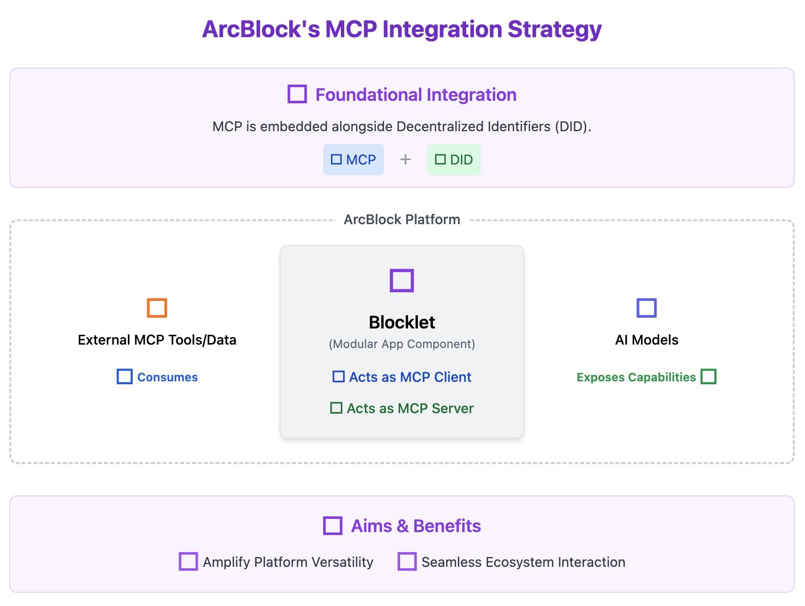 ArcBlock intends to integrate MCP at a foundational level alongside its decentralized identifier (DID) protocol. Each "blocklet"—ArcBlock’s modular app components—will function as both an MCP server (exposing capabilities to AI models) and an MCP client (consuming external MCP-compatible tools). This dual integration aims to amplify ArcBlock’s platform versatility, enabling seamless interaction with the broader MCP ecosystem. While specific plans may evolve, this aligns with ArcBlock’s focus on modular, interoperable software called Blocklets.