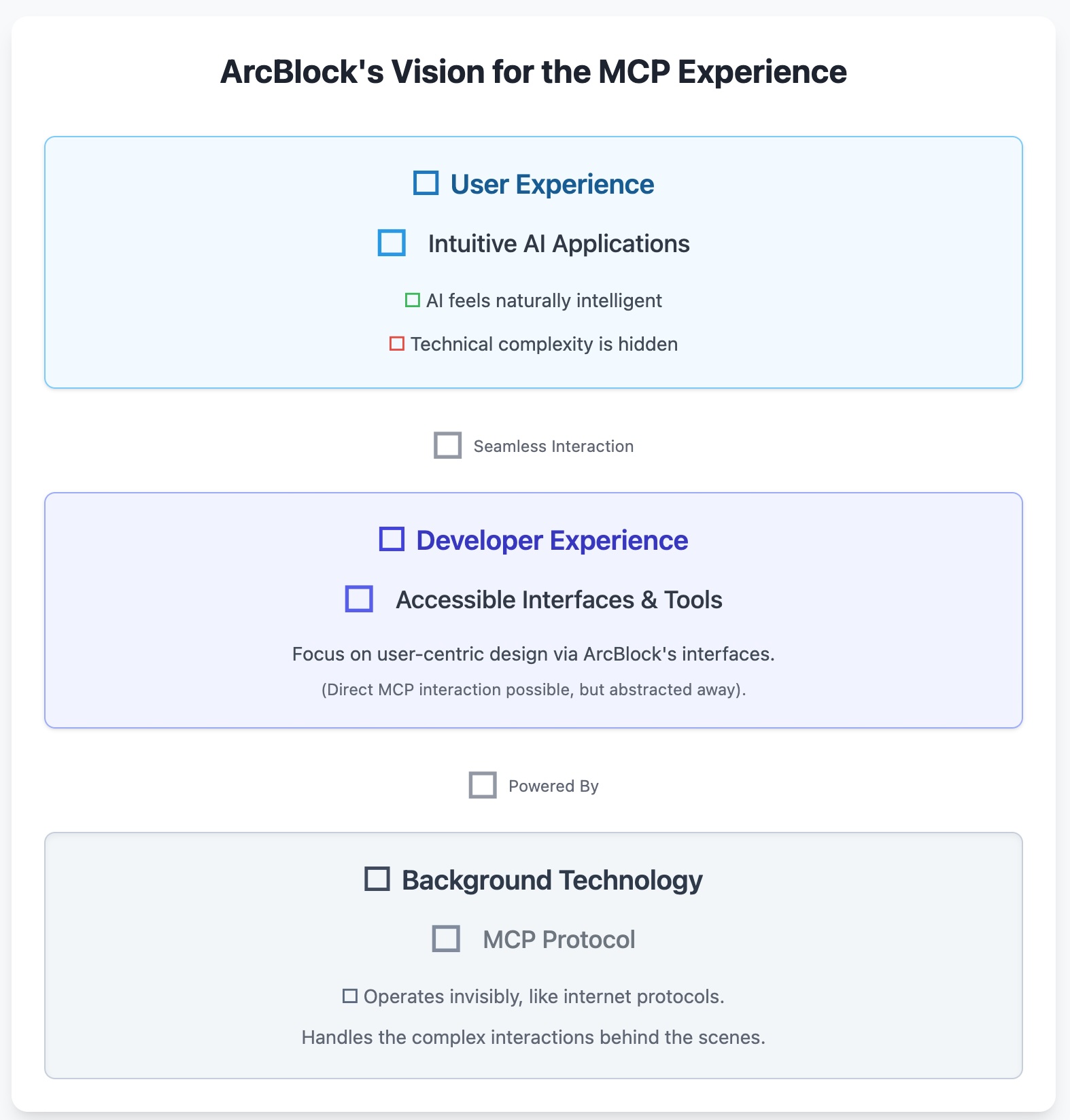ArcBlock aims for MCP to operate invisibly, much like internet protocols, delivering intuitive AI-driven applications without exposing technical complexity to users. Developers may initially engage with MCP directly, but ArcBlock’s strategy focuses on crafting accessible interfaces and ensuring anyone can access the tools and services they need for their project. The goal is an experience where AI feels naturally intelligent, powered by MCP in the background.