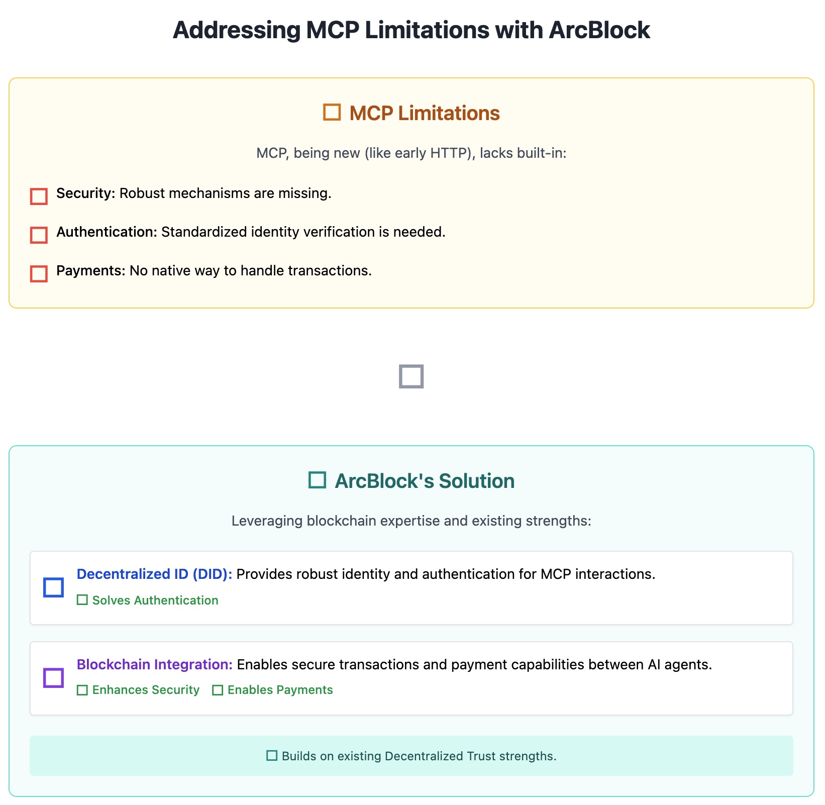 MCP lacks robust built-in security, authentication, and payment mechanisms—similar to early HTTP arXiv, "Model Context Protocol (MCP): Landscape, Security Threats," 2025. ArcBlock addresses these by leveraging its blockchain expertise. It plans to utilize its DID protocol for decentralized identity and authentication and use blockchain for secure, payment-enabled transactions among AI agents. This approach builds on ArcBlock’s existing strengths in decentralized trust ArcBlock, "Decentralized Identity".