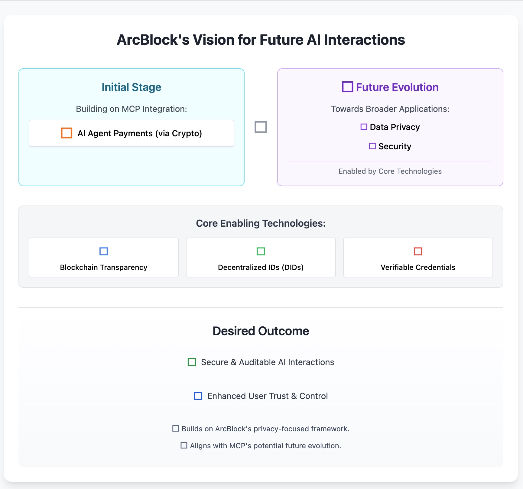 ArcBlock envisions a progression from AI agent payments via cryptocurrency to broader applications like data privacy and security. Using blockchain’s transparency, DIDs, and verifiable credentials, ArcBlock aims to ensure secure, auditable AI interactions—enhancing user trust and control. This builds on its privacy-focused framework ArcBlock, "Data Privacy Solutions"] and aligns with MCP’s potential evolution arXiv, "MCP: Future Directions," 2025].