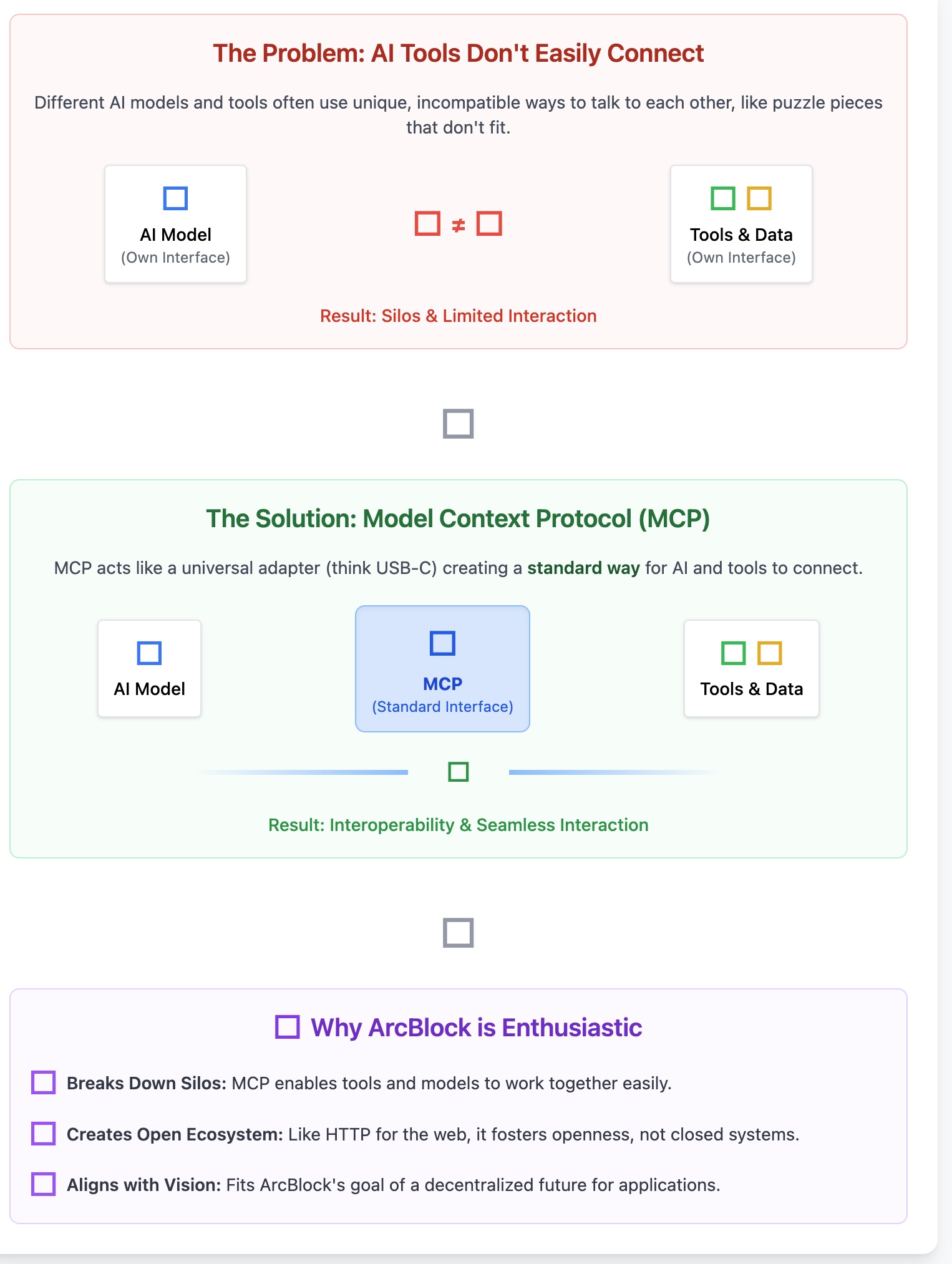 The Model Context Protocol (MCP) is an open standard introduced by Anthropic in November 2024 that enables AI models to interact seamlessly with external tools and data sources via a standardized interface. It’s likened to a “USB-C for AI,” fostering interoperability across diverse systems, "Introducing the Model Context Protocol." ArcBlock, a platform for building decentralized applications, is adopting MCP because it addresses the AI industry’s interoperability challenge, breaking down silos between models and proprietary tools. ArcBlock sees MCP as a game-changer—akin to HTTP’s impact on the web—unlocking a dynamic, open AI ecosystem that aligns with its decentralized vision.