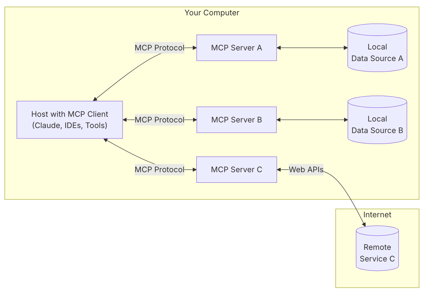 - MCP Servers (The "Data Providers"): These are lightweight programs, each designed to expose specific capabilities or data sources through the standardized MCP protocol. Think of these as the data ports.