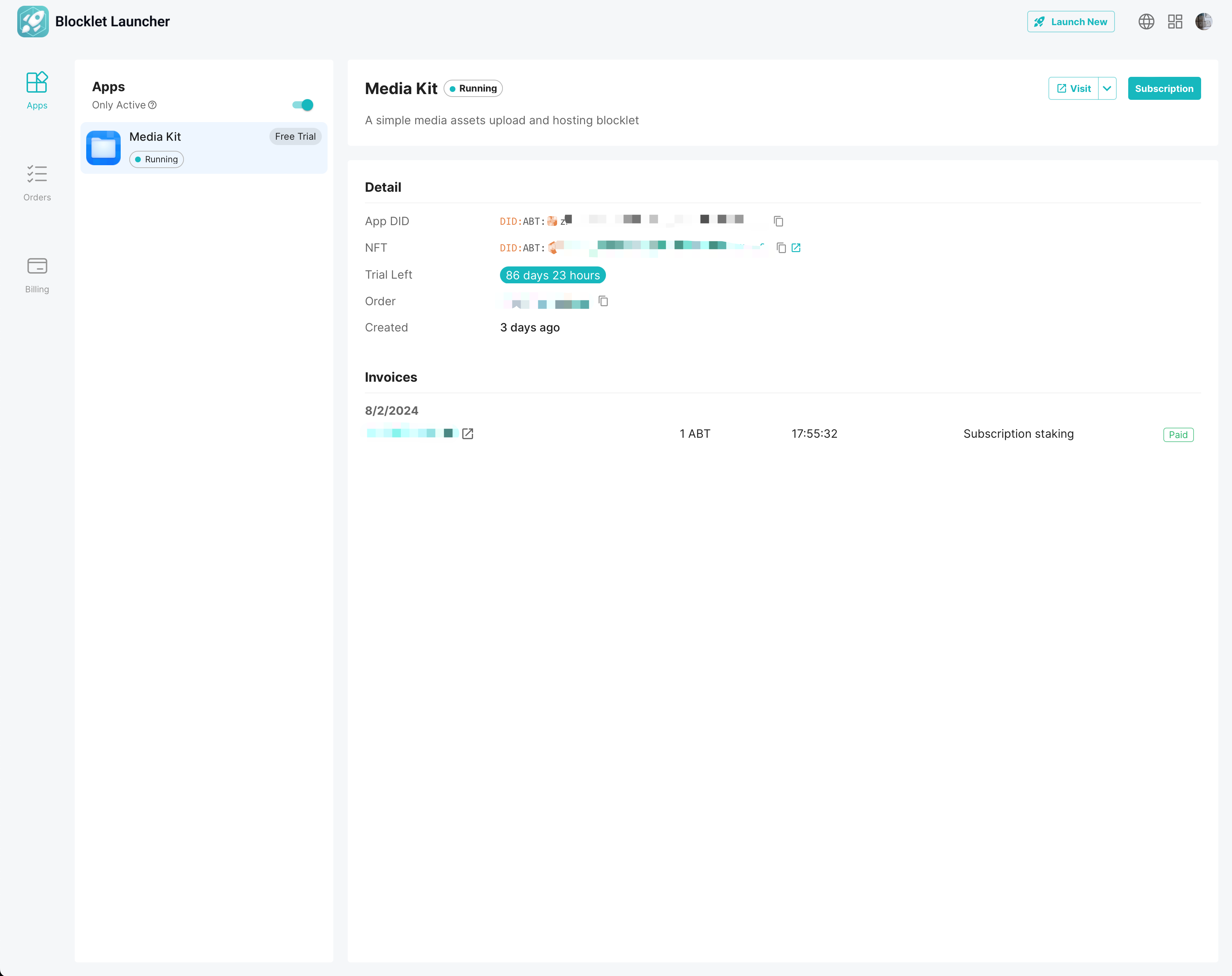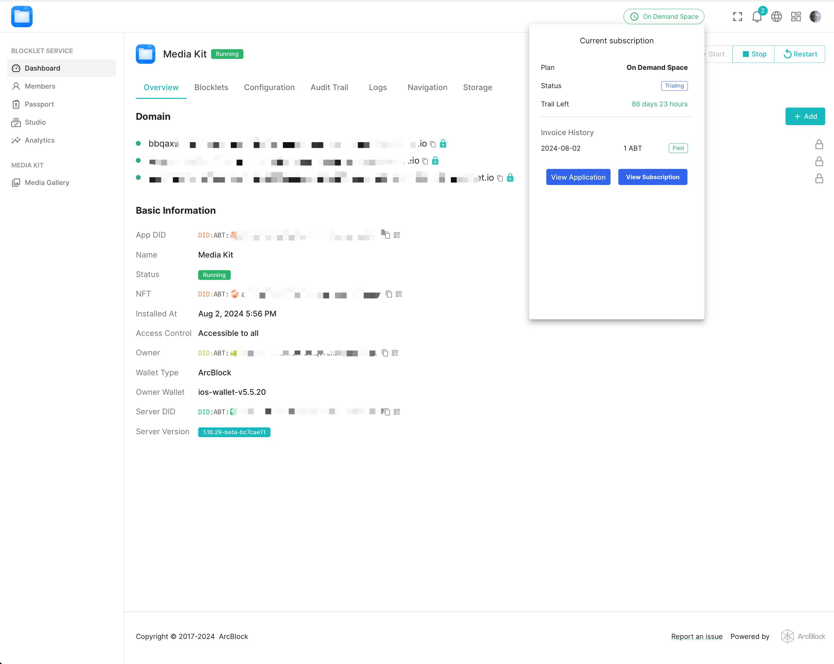 - ArcBlock reserves the right to adjust or terminate the trial policy based on actual usage. Termination of the trial policy will not affect applications that have already been launched.