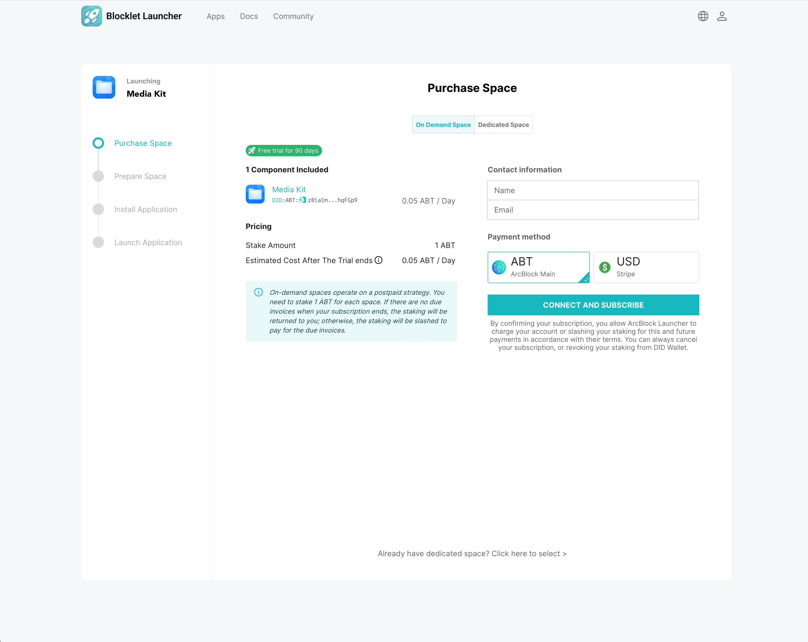 For users to test and explore the ArcBlock platform at a lower cost, unleash their creativity, and build their own applications, ArcBlock Launcher now offers a 30 days free trial service for On-demand Space. You only need to stake 1 ABT to use the on-demand Blocklet space for free. You can cancel and return the staked ABT at any time during the trial period. If you do not cancel at the end of the trial period, you will be automatically charged on a billing cycle.