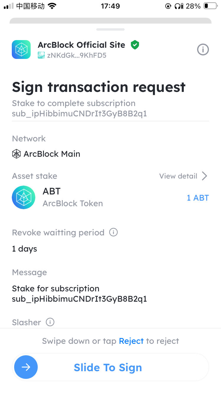 The subscription page displays information related to the free trial. If you use ABT payment, you need to stake 1 ABT when subscribing:
