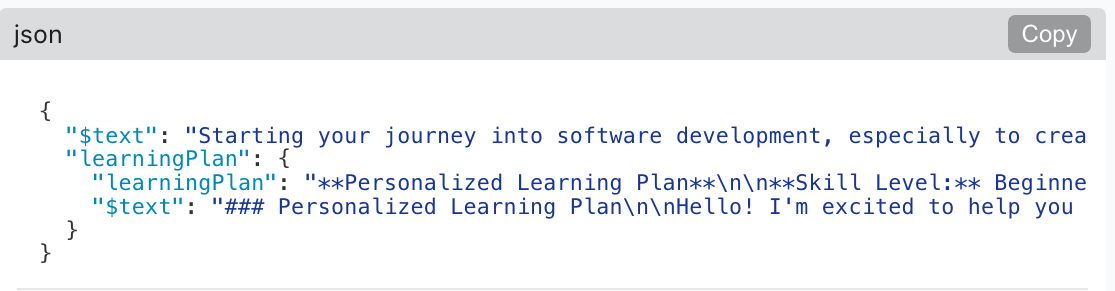 Based on the input, you can see the text-based plan that gives me a range of learning steps, plus the JSON output confirming the plan's details.