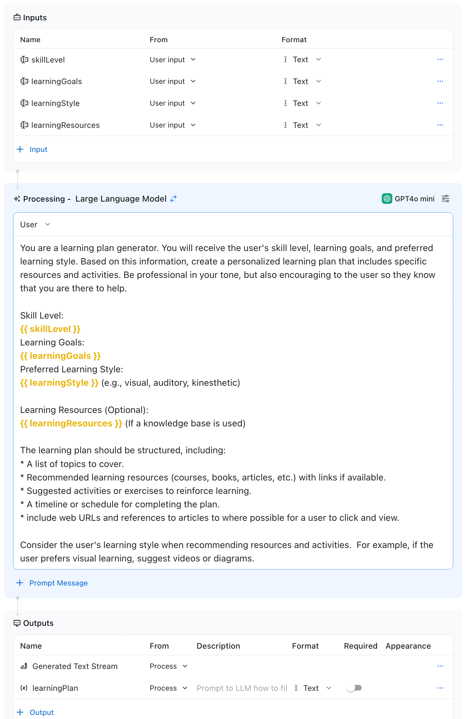 - Purpose: Generates a personalized learning plan based on the user's inputs which included their skill level and learning goals.