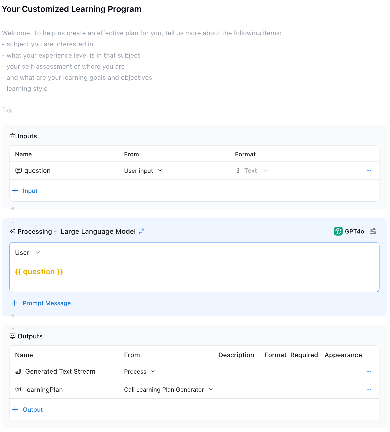- Purpose: Assess the user's current skill level in a given subject. This could be done through multiple-choice questions, self-assessment, or even by analyzing the user's past experience (if available). It's important to include some type of request for information from the user in your AI App.