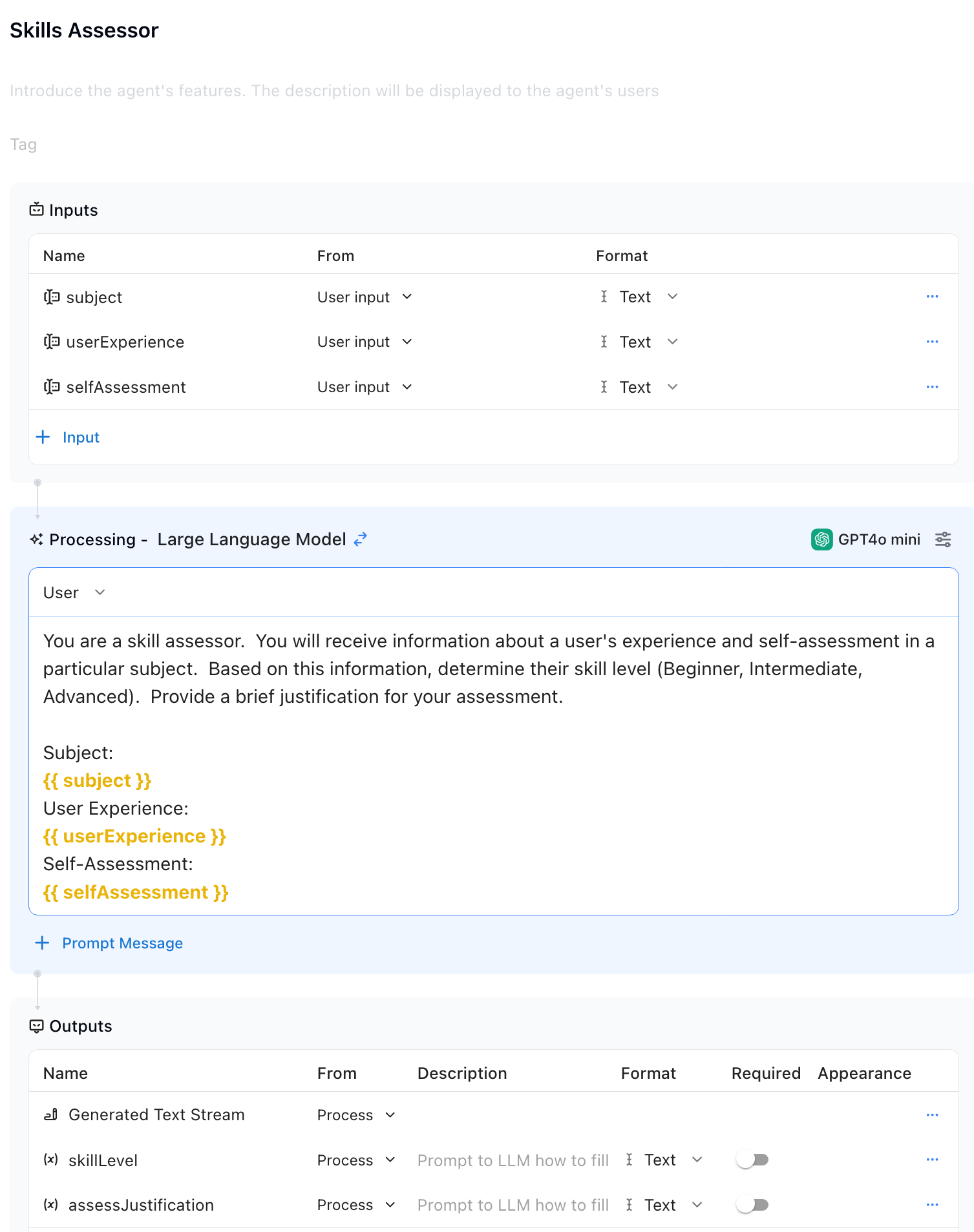 - User Interaction for Assessment: This agent scenario requires interactive input from the user for the skill assessment.