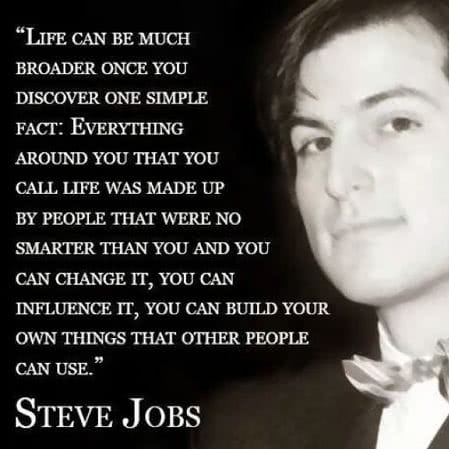 “Life can be much broader once you discover one simple fact: Everything around you that you call life was made up by people that were no smarter than you and you can change it, you can influence it, you can build your own things that other people can use. — Steve Jobs