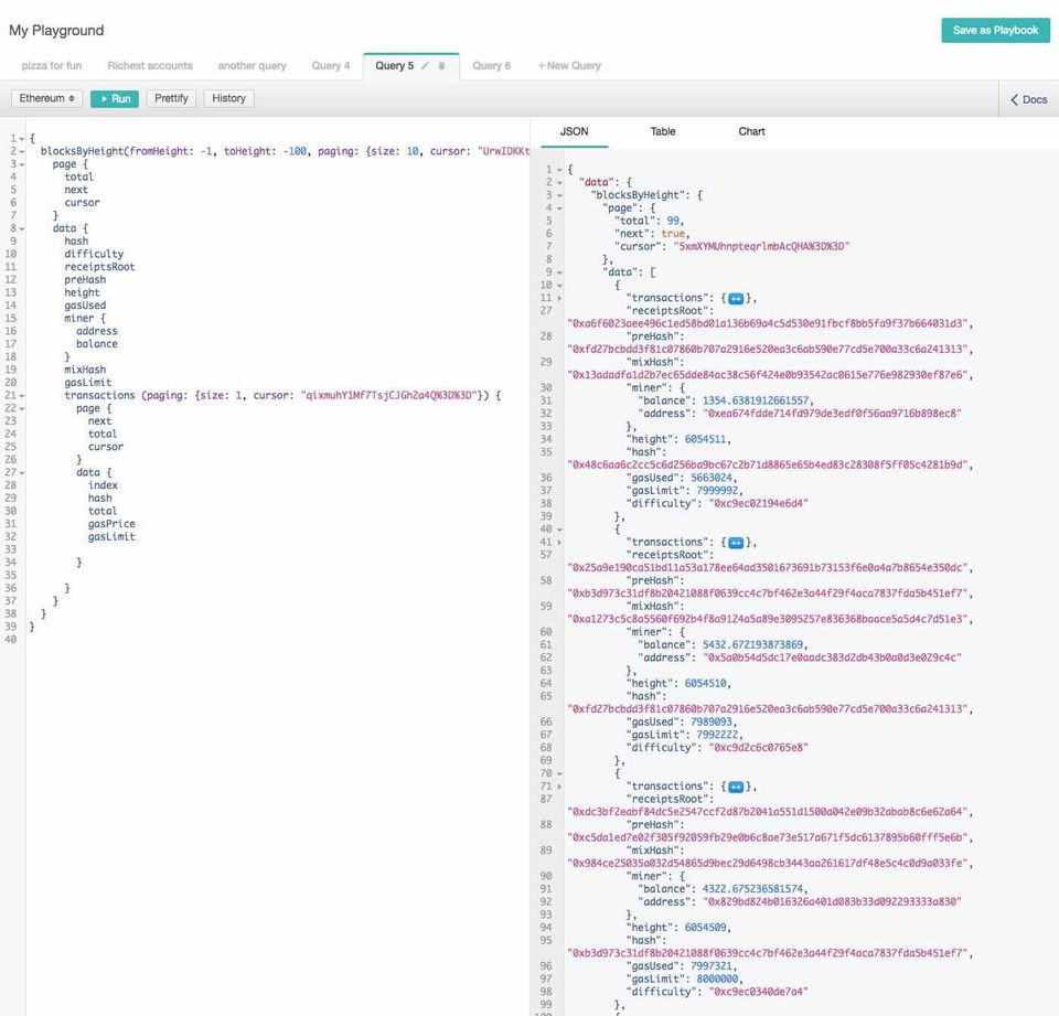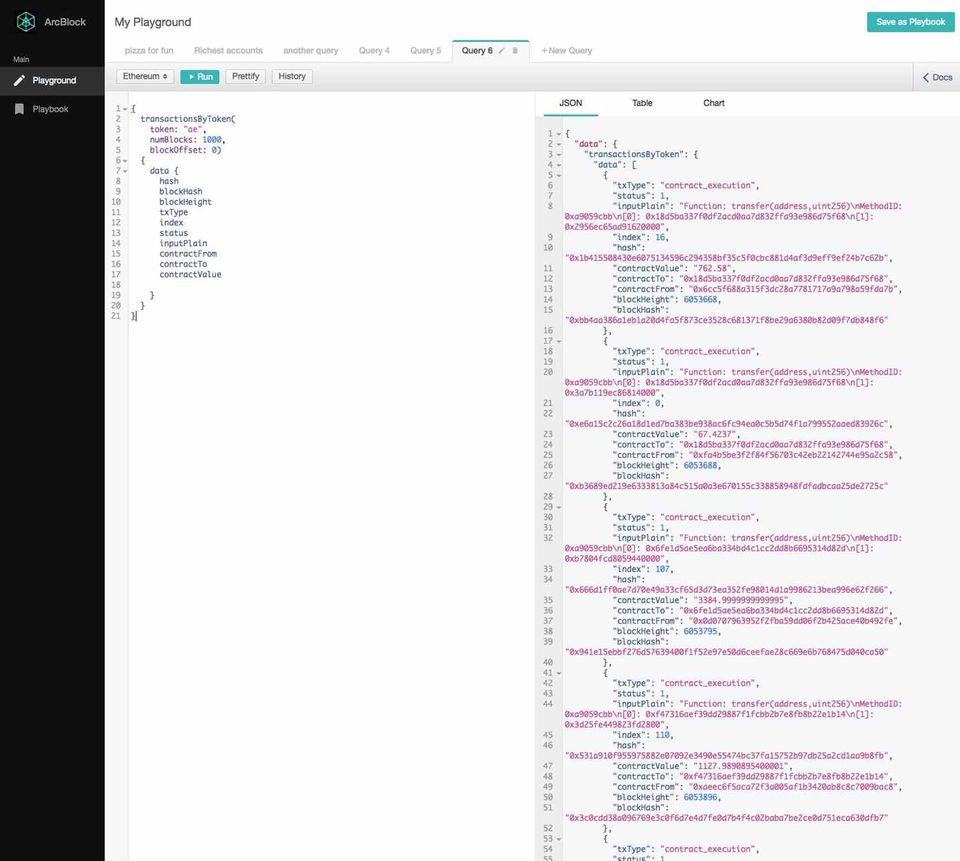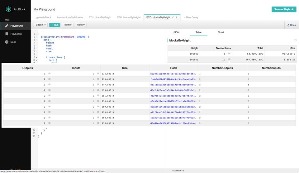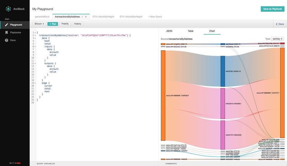 ArcBlock's first app, "OCAP Playground", has released 20 internal versions since June 30. Interface interaction details have been optimized, and the Table view and Chart view of the result display area have been improved. The new Table view supports the presentation of nested data, and the format of the data fields is as user-friendly as possible. For example, the account balance can be shown in BTC. Block List and Transaction List have been added in the Chart view. The Transaction List uses the classic Sankey Diagram to visualize the flow of money in the blockchain network, so as to help developers make more valuable discoveries when previewing the query results.