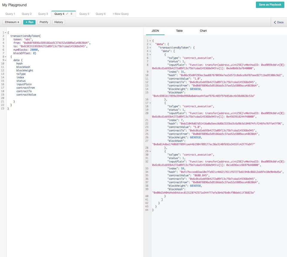 On July 30, OCAP added the Ethereum API to support data query on the Ethereum chain, such as all ERC20 Token transaction data (figs. 1 and 2), as well as filling in block height negative values to query block data in new and old order (fig. 3). At this point, the OCAP Playground can be used to query the most mature public chain data of bitcoin and Ethereum.