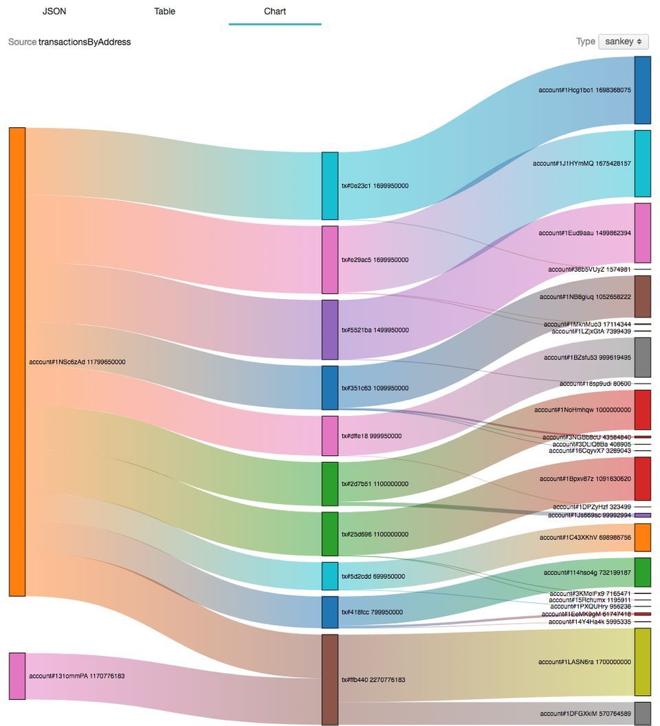 区块链网络就是张巨大的价值流动网络,价值流动的载体就是交易,而 Sankey Diagram 在可视化网络流时非常直观,于是有了下面的可视化支持: