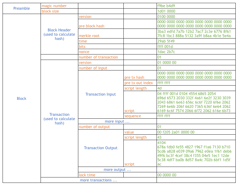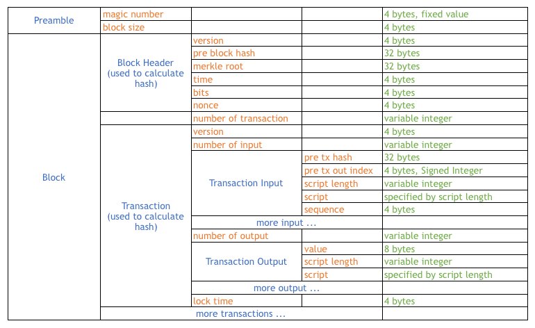 - Each section consists of a preamble and a block. A block consists of a block header, the number of transactions, plus those transactions. Each transaction consists of several simple data types and several transaction inputs/outputs. And so on.