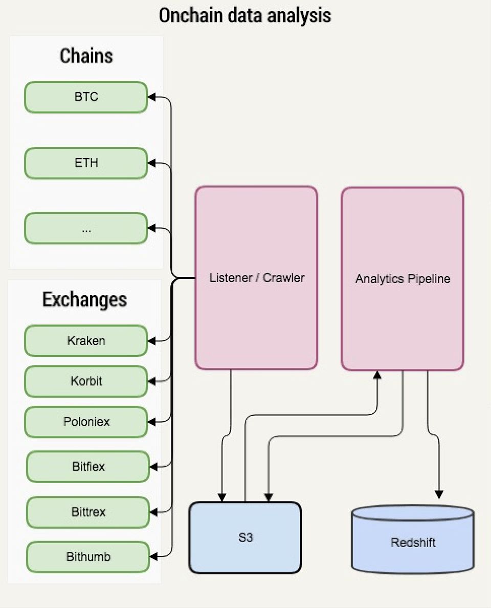 To better analyze the data, we have indexed the data on Bitcoin and Ethereum and started real-time data listeners to keep the data updated. In previous articles, we have introduced how we indexed on-chain data. For the data processing, we use AWS Kinesis to stream the data into parquet format and store them on S3. Meanwhile, the data are also fed into our data pipeline, where we perform cleaning and aggregation using Apache Spark, and send the aggregated data to Redshift, where they are ready for further queries and visualizations.