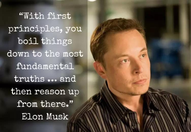 第一性原理(First principles),最早来自于古希腊哲学家亚里士多德,他说:“在每个系统探索中存在第一性原理。第一性原理是基本的命题和假设,不能被省略和删除,也不能被违反。” 在现代,第一性原理就是数学公理、物理学定律,不言自明、可演绎推导出万物运行规律和现象。埃隆·马斯克(Elon Musk)是充分应用第一性原理创办特斯拉、Space X 和 Solar City 三家初创企业,同时在汽车、航天和新能源领域掀起颠覆性创新的企业家,他说,“我们运用第一性原理,而不是比较思维去思考问题是非常重要的。第一性原理的思想方式是用物理学的角度看待世界,也就是说一层层拨开事物表象,看到里面的本质,再从本质一层层往上走。”