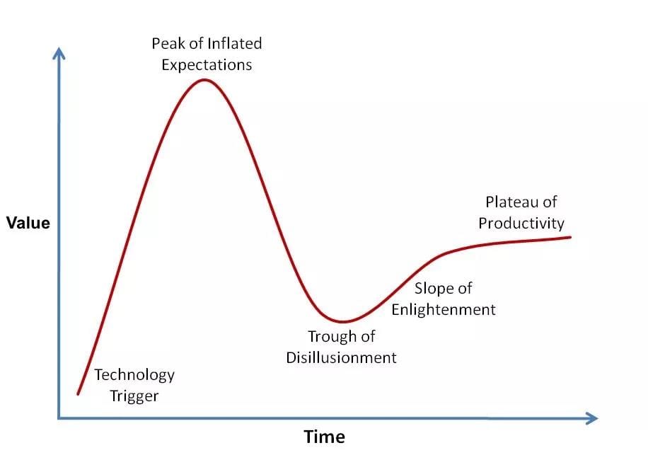 Gartner 技术成熟度曲线(The Hype Cycle)揭示了每一波技术浪潮都是从萌芽到泡沫,到泡沫崩溃,然后从低谷慢慢地起来,最后再成长起来.
