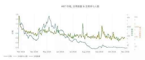 Above is a line chart with ABT prices, number of transactions, and number of participants. Where the blue line represents the price change of ABT, and the green line is the number of daily ABT transactions. It can be seen from the data analysis results that the trading volume of ABT has maintained a relatively stable range.