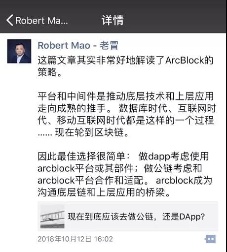 On October 12, Rober Mao said, in a retweet of a media article, "Platforms and middleware are driving the maturity of the underlying technology and upper applications. The database age, the Internet age, and the mobile Internet age all had their process... Now it's blockchain's turn. "