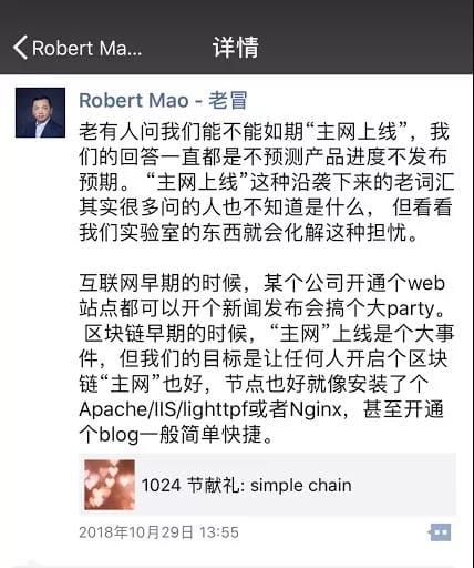 As for the launch of the main network, Mao expressed his opinion on October 29 by forwarding a blog post by Chen Tian, Vice President of Research and Development: for ArcBlock, the goal is not only to launch the main network, but to make the main network of any application easier and faster. Many misconceptions and outdated ideas linger in the blockchain community today, such as "mainline online", a very misleading term.