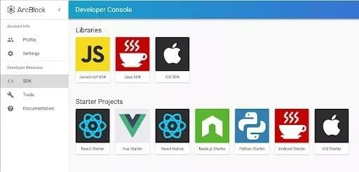 The Developer Console also contains links to various SDKs, the Starter Project, development tools, code samples and other contents provided by ArcBlock for developers to find what they need and start developing their applications quickly.