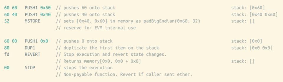 PUSH1 0x60 PUSH1 0x40 MSTORE CALLVALUE ISZERO PUSH1 0xE JUMPI PUSH1 0x0 DUP1 REVERT JUMPDEST PUSH1 0x1 PUSH1 0x0 DUP2 SWAP1 SSTORE POP PUSH1 0x35 DUP1 PUSH1 0x23 PUSH1 0x0 CODECOPY PUSH1 0x0 RETURN STOP PUSH1 0x60 PUSH1 0x40 MSTORE PUSH1 0x0 DUP1 REVERT STOP LOG1 PUSH6 0x627A7A723058 KECCAK256 0xd3 ISZERO DUP8 0x5f JUMP 0xb5 ORIGIN 0xab CALLDATACOPY SHR 0xf9 0xaa DUP7 0xa6 0x28 POP 0xe1 RETURNDATACOPY 0xb6 0xab NOT 0x48 0x47 ADD SAR 0xcd PUSH5 0x1B9A9D2F8D STOP 0x29上面的字节码或者操作码是等价的,它们都可以被分为三个部分: