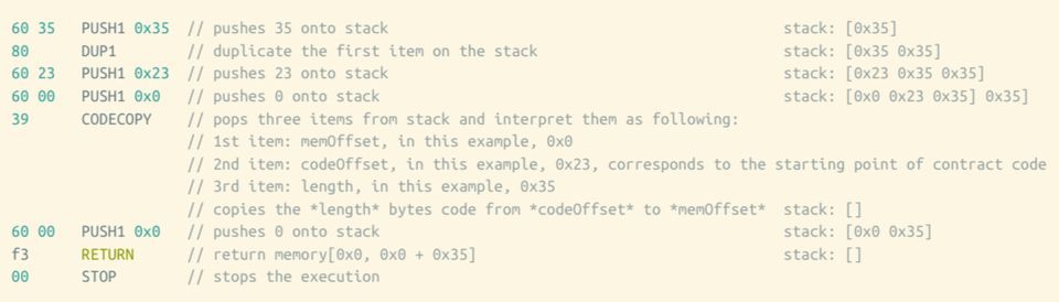 PUSH1 0x35 DUP1 PUSH1 0x23 PUSH1 0x0 CODECOPY PUSH1 0x0 RETURN STOP</br>