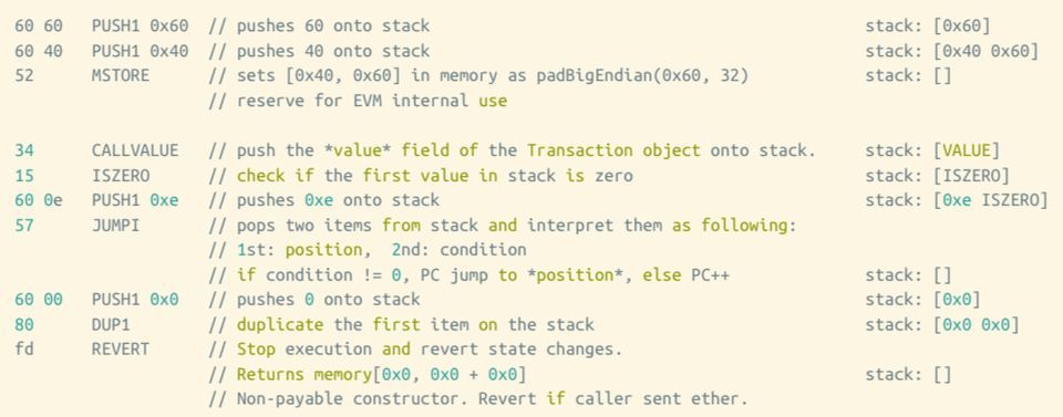 payable是 Solidity 的一个关键字,如果一个函数被其标记,那么用户在调用该函数的同时还可以发送以太币到该智能合约。而这部分字节码的意义就在于阻止用户在调用没有被 payable 标记的函数时,向该智能合约发送以太币。下面这张图是对这段代码进一步演算,左边两列分别是字节码和操作码,最右边一列是执行完该条语句之后栈的状态。