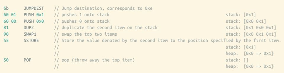 在上图中,JUMPDEST对应上面的0xe,它代表了如果通过上面的 payable 检查,我们应该跳转到这里继续执行代码。SSTORE命令是用来将栈上的值存储到 World State 上的。在图中我用了 heap 来代表 World State 是因为它们俩有很多相似之处。我们知道在 Java 里面,栈是用来存储函数运行时的临时变量的,而堆是用来存储生命周期更长的变量,比如成员变量。栈上的数据会随着方法的执行完毕而被实时清空,而堆上的数据会在整个类实例的生命周期里面始终有效。Java 虚拟机不会将堆中的成员变量清空,除非该类的实例被回收。而一个部署到以太坊上的智能合约可以被认为是永远活着的合约实例(当然一个合约也可以被杀死)。所以用来存放智能合约状态的 World State 就可以被看做是以太坊的 heap。在这里我之所以用 heap 来代指 World State,第一是希望跟 stack 做一个呼应,第二是希望从另一个方面描述以太坊的本质:以太坊是一个计算机网络,它将整个网络里面的所有计算机连接起来形成一个单一计算机。在这个计算机中,它使用数据结构来模拟内存的工作机制从而实现图灵完备的编程语言。