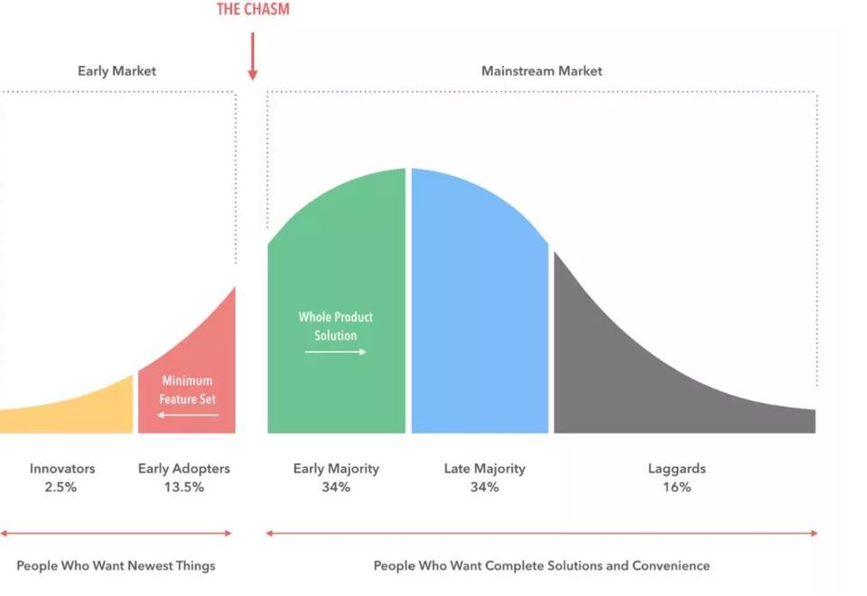 In the graphic below, you can clearly see the “chasm” between early adopters and the early majority. So, what is the next logical step for blockchain? How do we enable developers to build “delightful” applications and how do we create amazing user experience with blockchain?