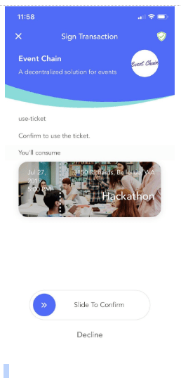 Like before, this is another transaction you need to confirm. Your ABT wallet will help you pick out the required asset. By sliding through the bar, ABT wallet is generating your signature verifying that you indeed want to use the ticket. Upon completion, you can not re-sell it to other people or re-use it for the event.