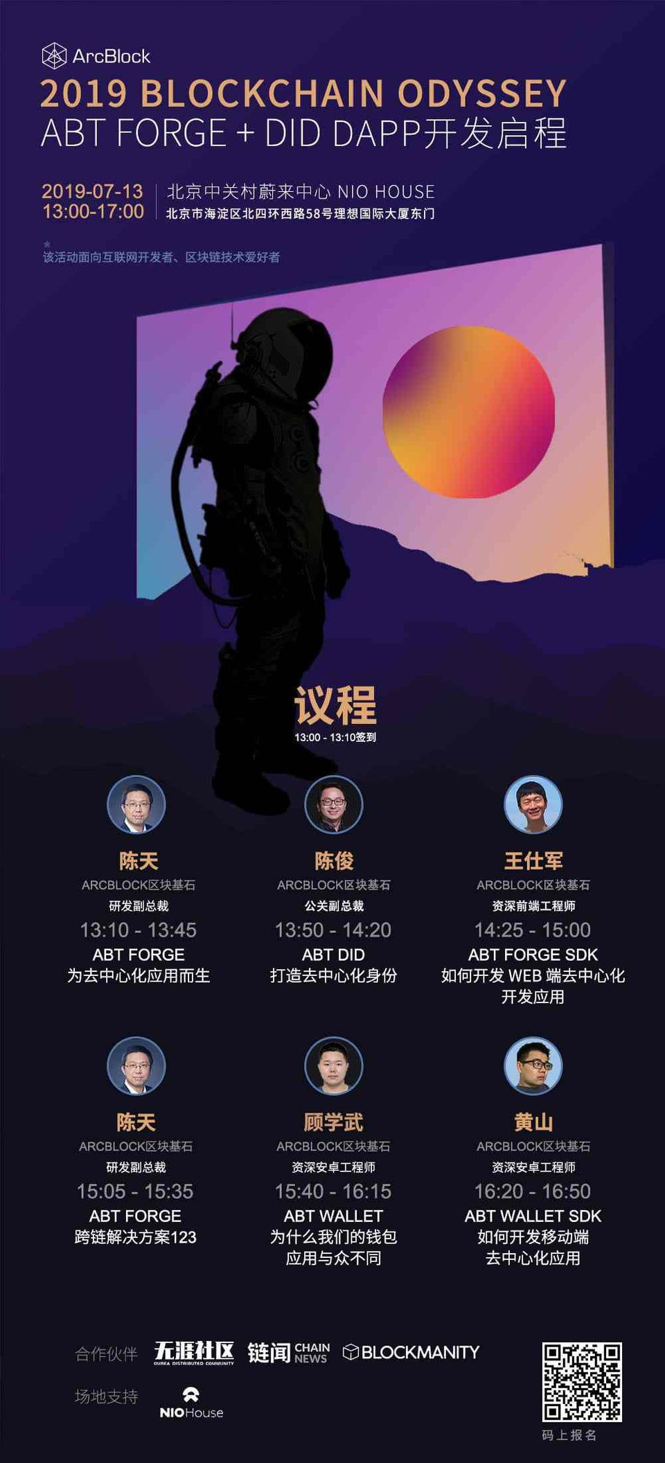 Nowadays, Forge Blockchain Application Framework and Forge SDK have been developing for more than half a year, and ArcBlock's application development platform built around Blockchain 3.0 is becoming better. In this process, the team has been continuously evolving, receiving feedback, learning, and sharing what we have learned in our ArcBlock Technical Learning Series. Although most of the content about the Forge framework can be found in the official training channel, the community users' frequently ask to hold a one-stop, multi-disciplinary lecture similar to the "blockchain technology guide." With the help of friends, our community, the Chain News, Blockmanity, and NIO Auto, ArcBlock is launching the "2019 Blockchain Odyssey Beijing Station: ABT Forge + DID, Dapp Development Made Easy" on July 13th.