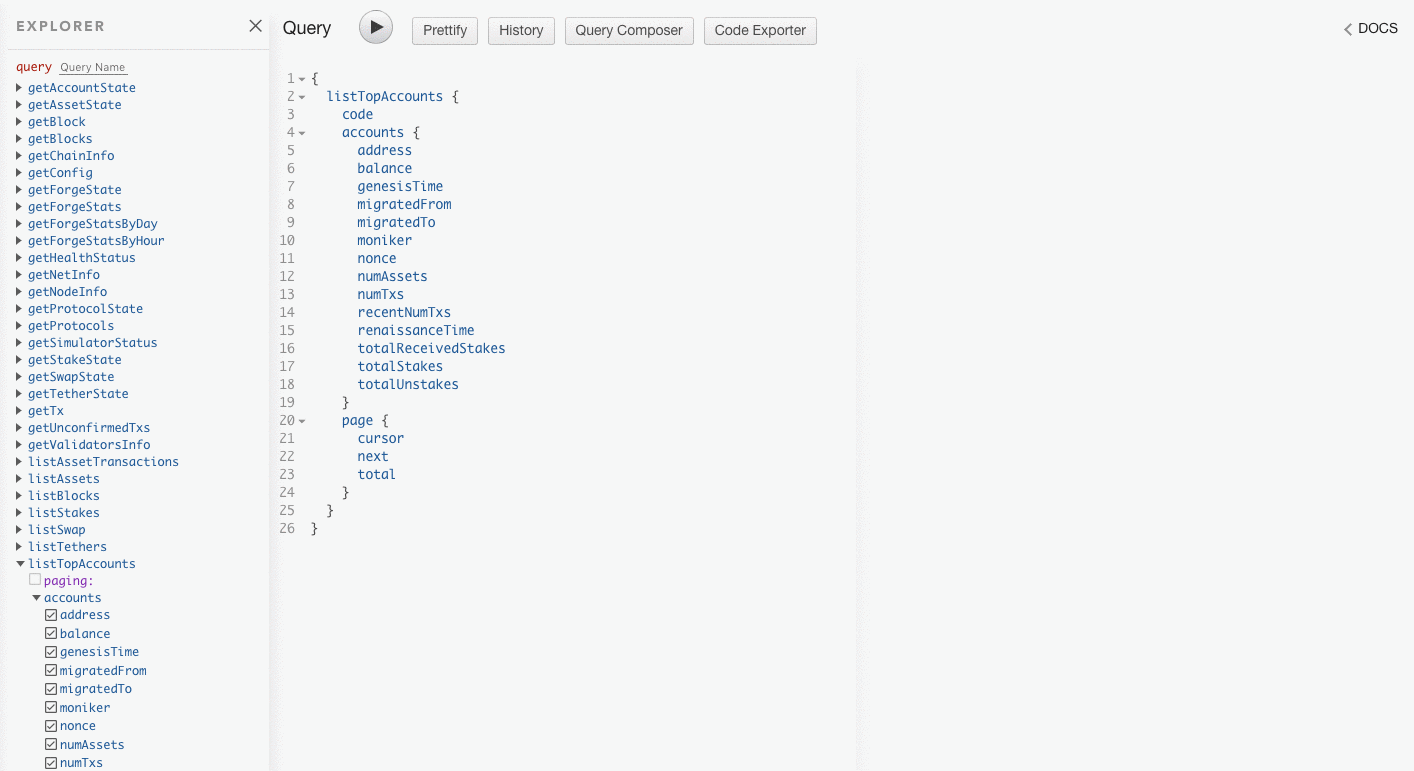 To view the interface, go to address, the new version integrates a powerful graphiql-explorer, and developers can build powerful queries in just a few clicks.