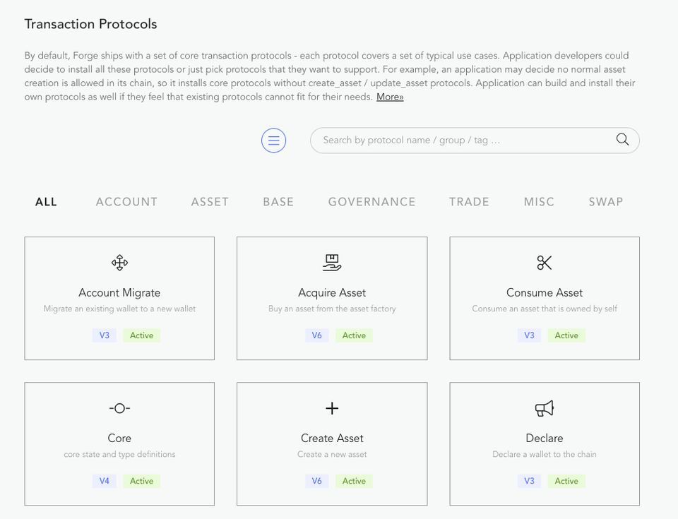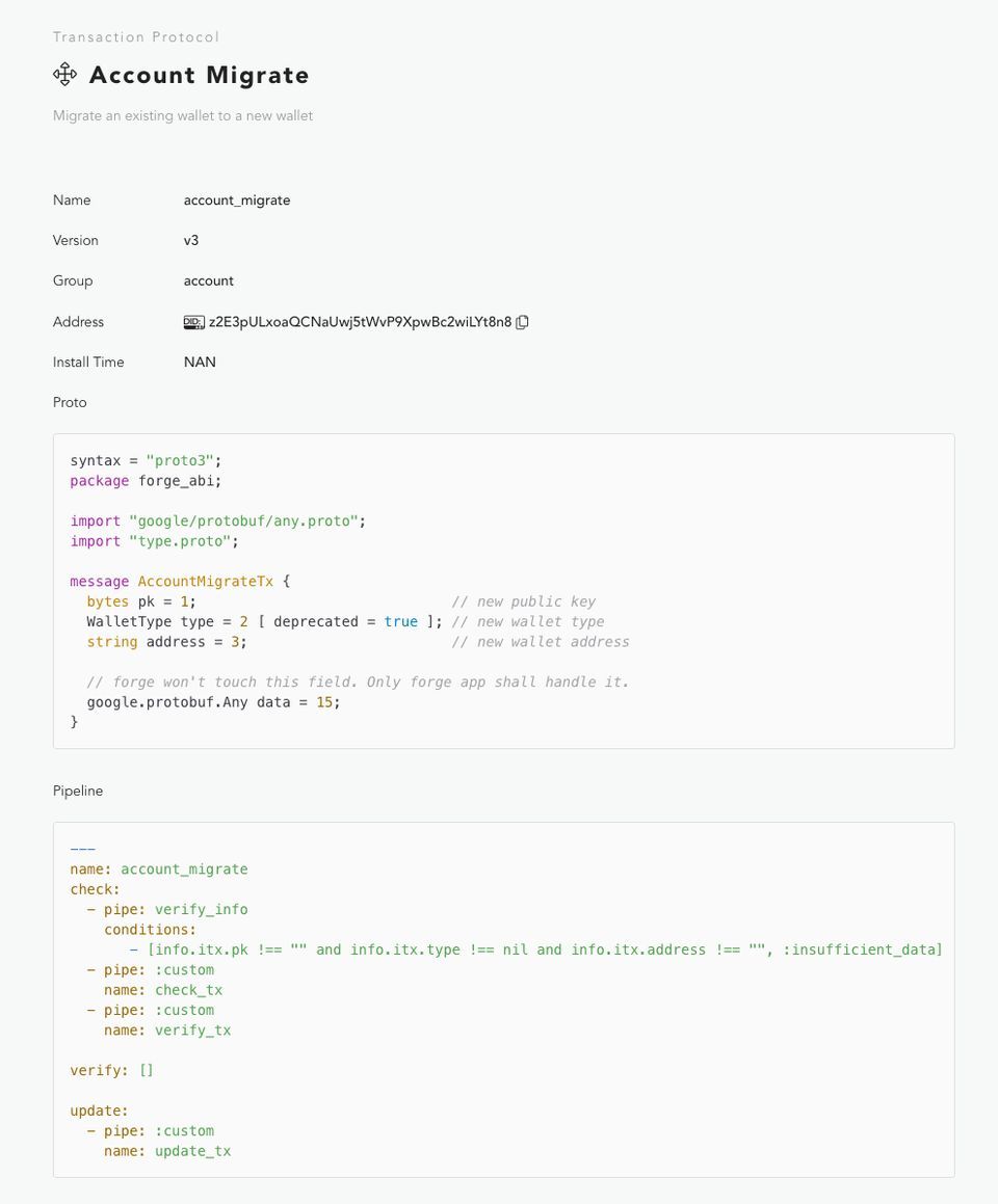 Details page shows the details of a Transaction Protocol, such as his processing pipeline, chain data validation, and update logic.