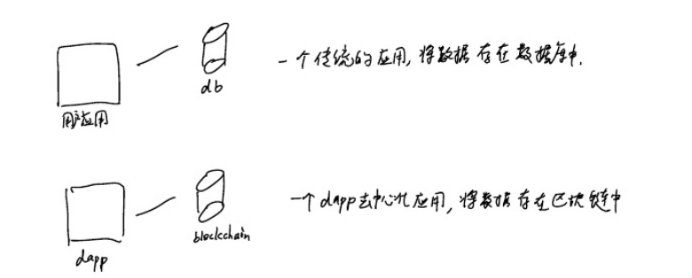 一个传统的应用把数据储存在数据库里,一个 dApp 去中心化应用把数据放在区块链之中。