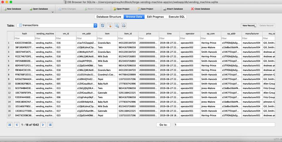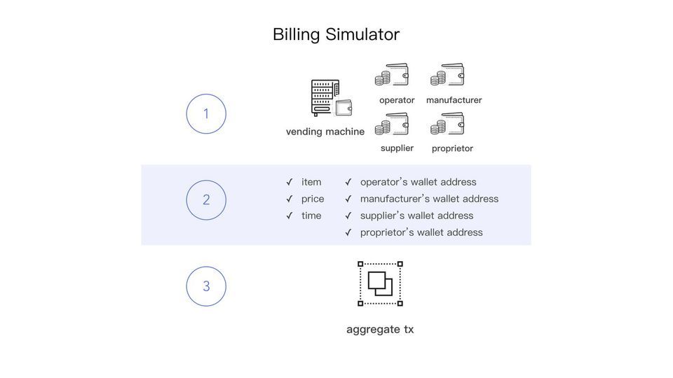 - Billing simulator. When it is first used, the simulator will create a certain amount of wallets for our vending machines and related parties. Then, it randomly generates all the data in a bill, including the item information (item’s name, price, and purchase time), as well as the merchant information (the relevant party wallet address). Later, it put those data to the chain by sending an aggregate transaction which we deployed last time. The simulator completes the two parts of my DApp, the creation of bills and the recording of bills.